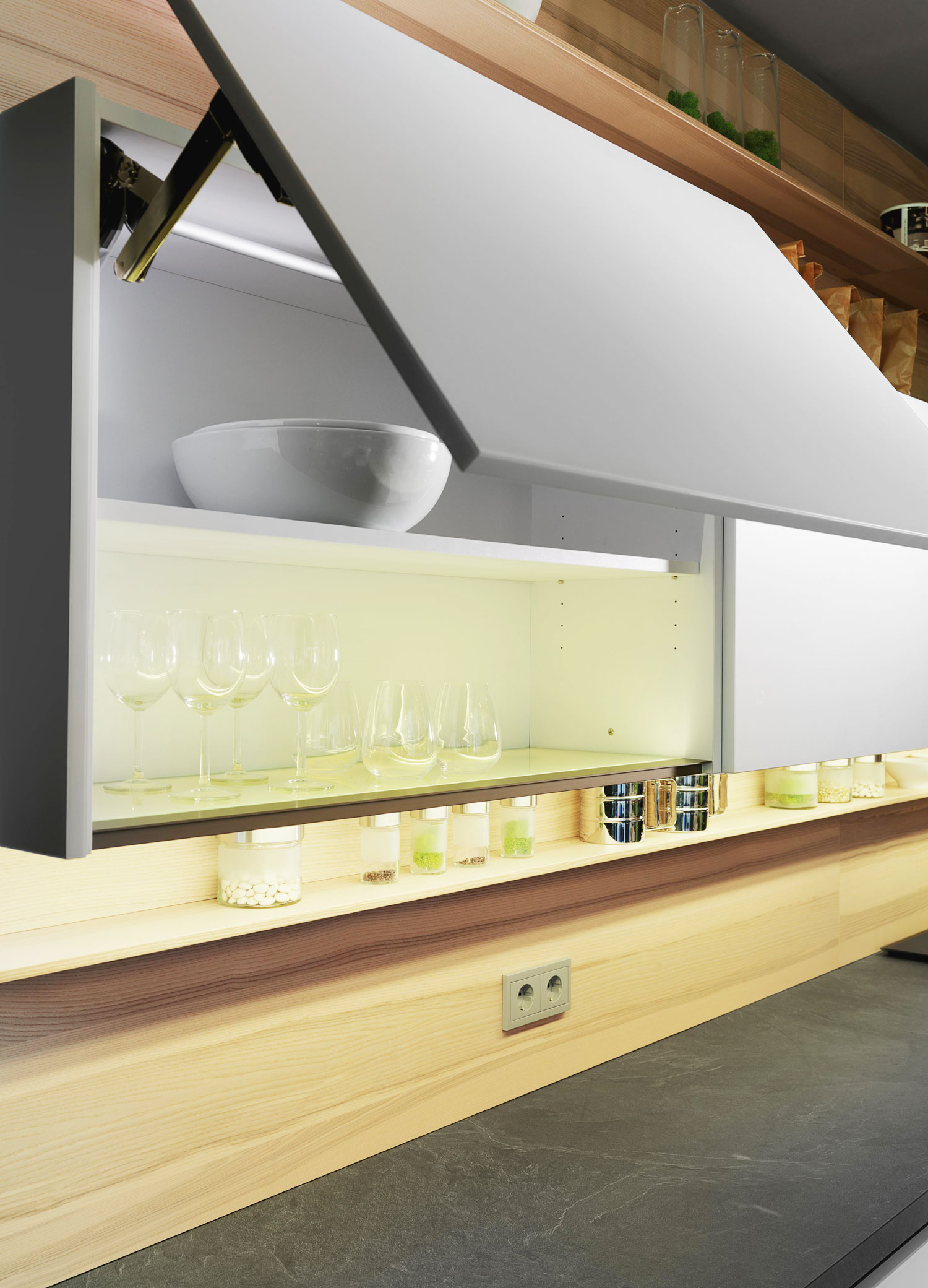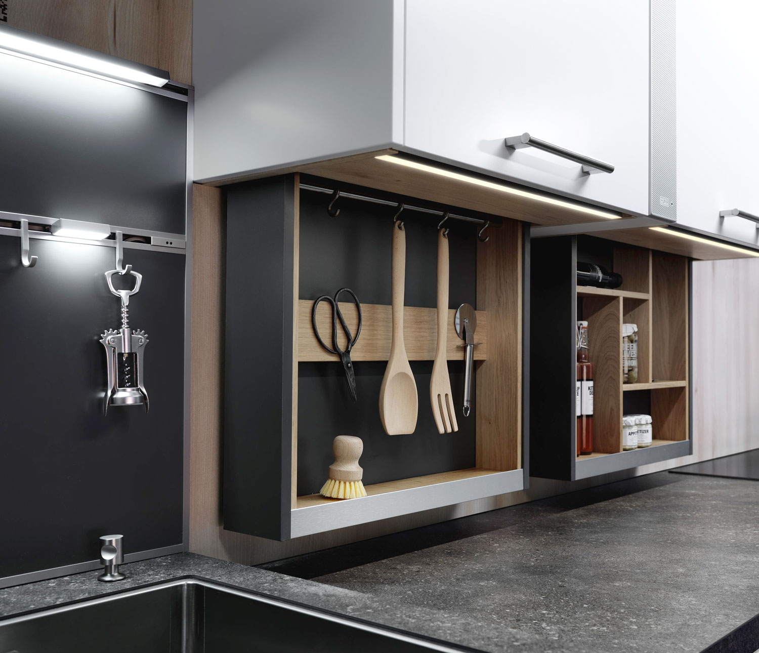Der Individualität sind hier keine Grenzen gesetzt. Ob freistehend im Raum, schwebend durch Wandmontage oder klassisch am Boden geblieben, die spannenden Materialkombinationen aus Kunststoff, Holz oder Lack machen aus dieser Küche ein Wohnelement der besonderen Art. Geradlinig, zeitlos, offen muss die neue Küche sein – und vor allem funktional.